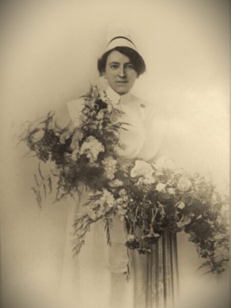 On June 9, 1916, Katherine, Winnifred, Olive, and five other nurses were presented with their diplomas during a moving ceremony at the Academy Theatre. Each of them no doubt knew that careers in civilian nursing would have to wait; a worsening war across the sea beckoned them to don the famous blue uniform of the C.A.M.C. and “do their bit.” Katherine herself was appointed as a nursing sister on Nov. 16, 1916. She was 30 years old and, in Canada’s military nursing hierarchy, automatically held officer status with the rank of lieutenant.