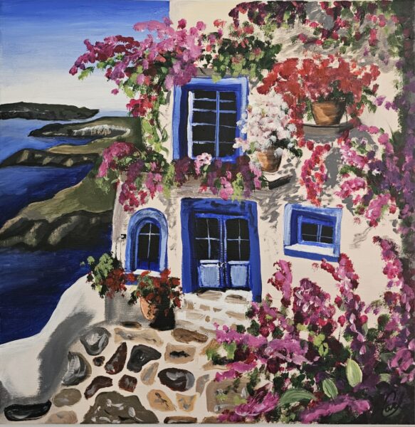Greek Getaway is a lovely painting, with brilliant colours and uneven lines, evocative of old-world charm and splashes of possibility. I bought it for my home office two months ago from local Bobcaygeon resident and artist Carley Reynolds.